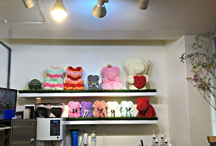 ▲櫥窗有各式甜點,櫃檯的後方也有手作的玫瑰花熊