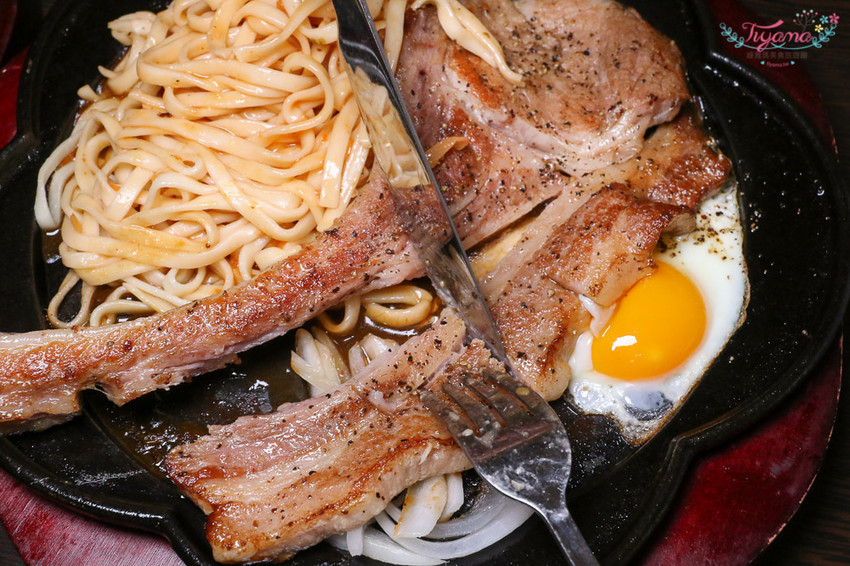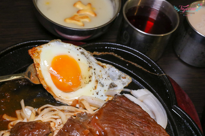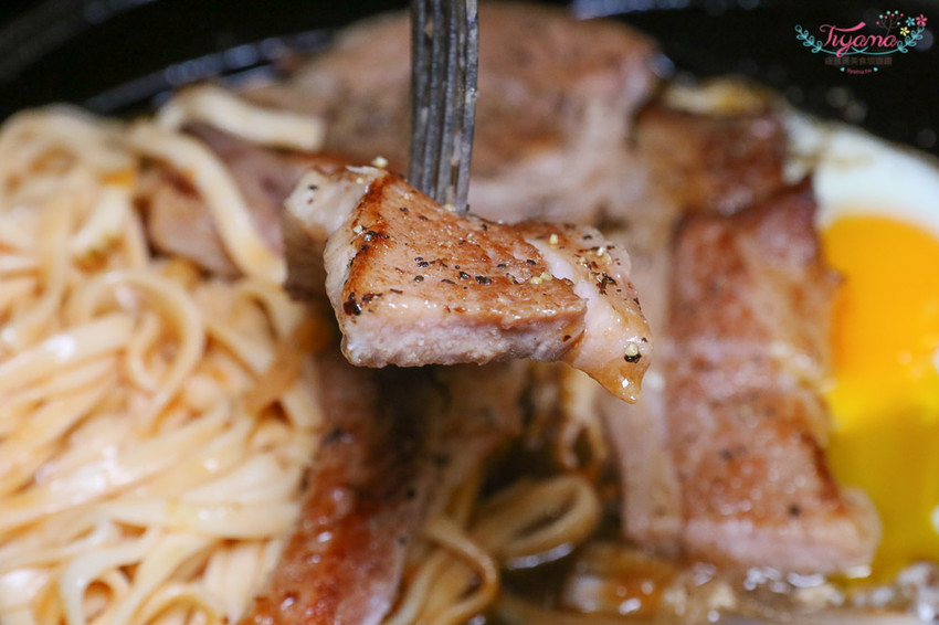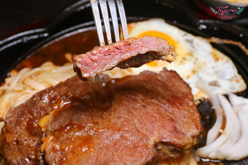 緹編愛沙朗邊邊帶勁帶油花的部份,中間較厚的瘦肉是緹爸愛的部位,完全不會吵架…哈哈,肉塊和麵沾上蛋黃汁液,滋味更讚…是我個人很喜歡的吃法!!