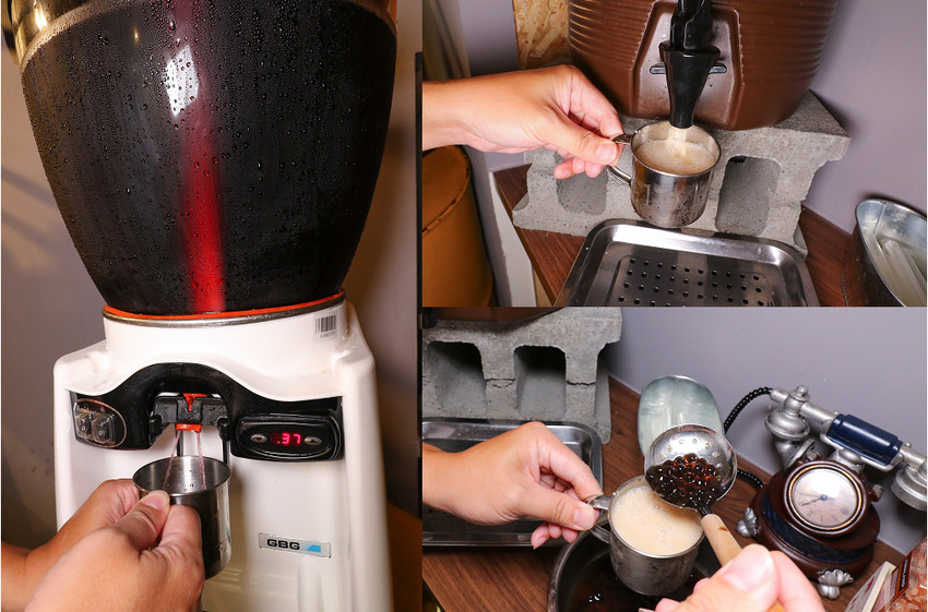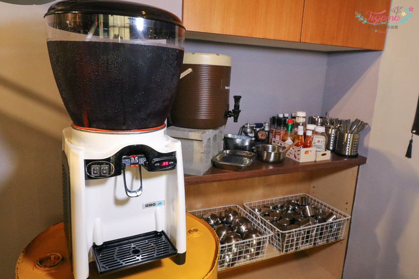 旁邊是飲料、餐具、調味料,飲料有果汁(葡萄汁)和珍珠奶茶,珍珠想加多少就加多少…增添不少樂趣!!