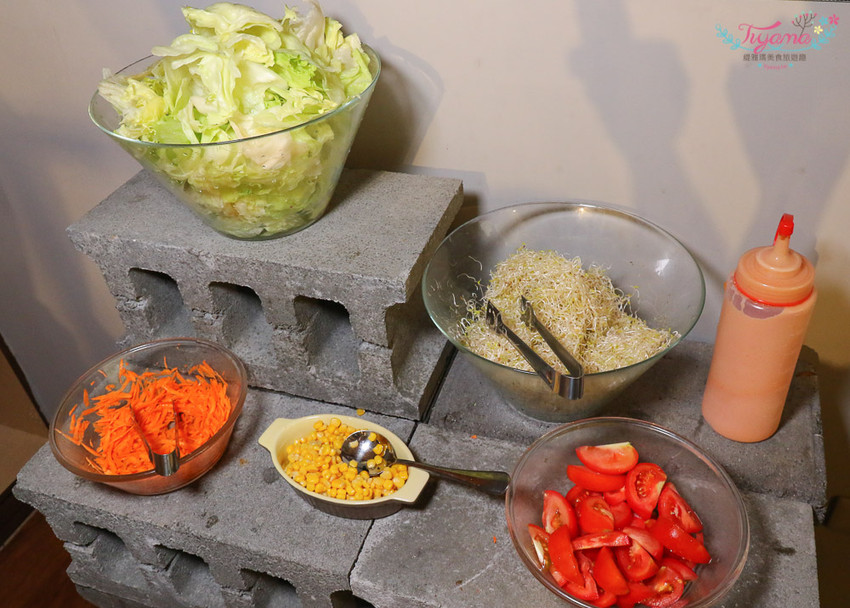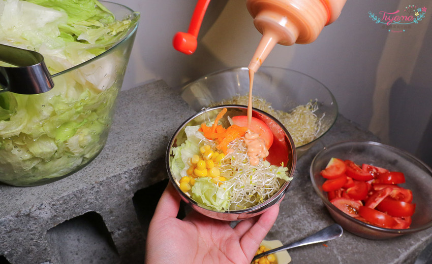 先到沙拉區拿沙拉,有生菜、苜蓿芽…等共5樣新鮮食材,千島醬的調味也很不錯…讓您大口吃肉的同時也能兼顧營養均衡。