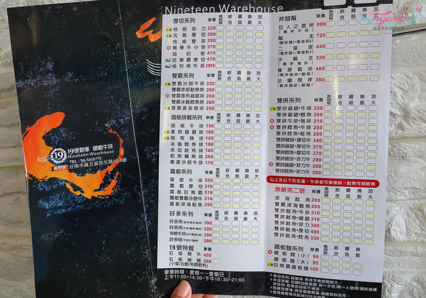 菜單好澎湃…有厚切系列、雙霸系列、鐵板排餐系列、霧都系列、斧頭幫、雙拼系列、無敵男二號、19號特餐、鐵板麵系列、好多系列,組合真的好豐富,多到我的選擇困難症都快要發作了!!對了…可換飯、免費加大,但一定要在點餐結帳前告知,不能事後補增加的唷!