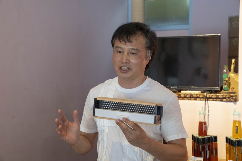 佳風蜜推廣在客廳養蜂方案,在家裡客廳規劃生態養蜂箱,利用蜜蜂出入口,可以讓它們出去採集花蜜,自己採收