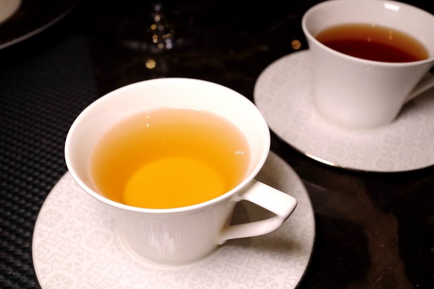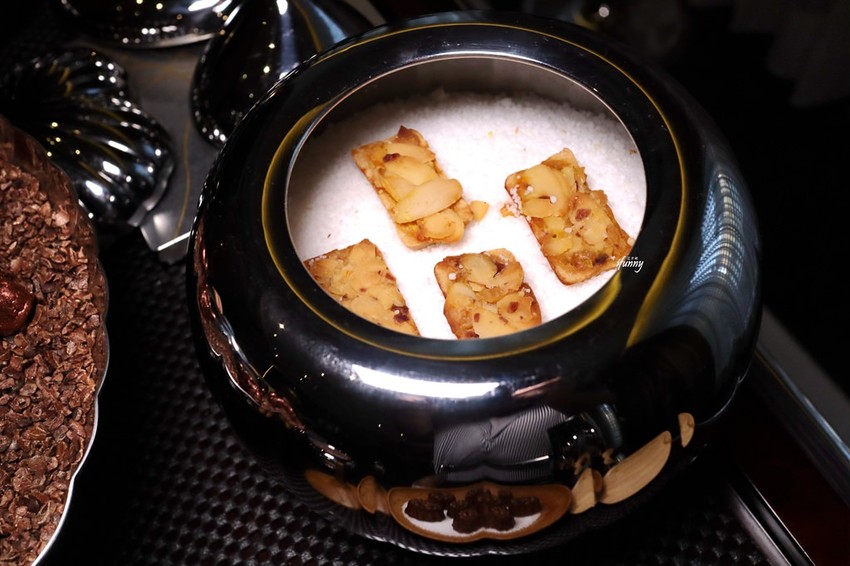 西式的酥皮配的不是玉米濃湯,而是中式的何首烏。以老母雞、雞腳、蔬菜等燉了13小時的雞湯,最後去蕪存菁的黃金雞湯,這也是德朗火鍋所用的湯底。而這天我們喝到的是以澄清雞湯再加入了桂丁雞、鴨肝、桃膠、打發蛋白、雞肉肉泥、蔬菜泥再煮了5個小時而成。這經歷中式與法式手法的湯底,喝來甘醇不油膩,滋味豐富。以切成小塊的酥皮麵包沾著食用,別有風味。
