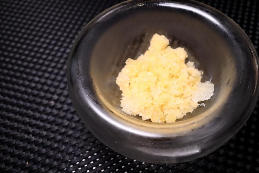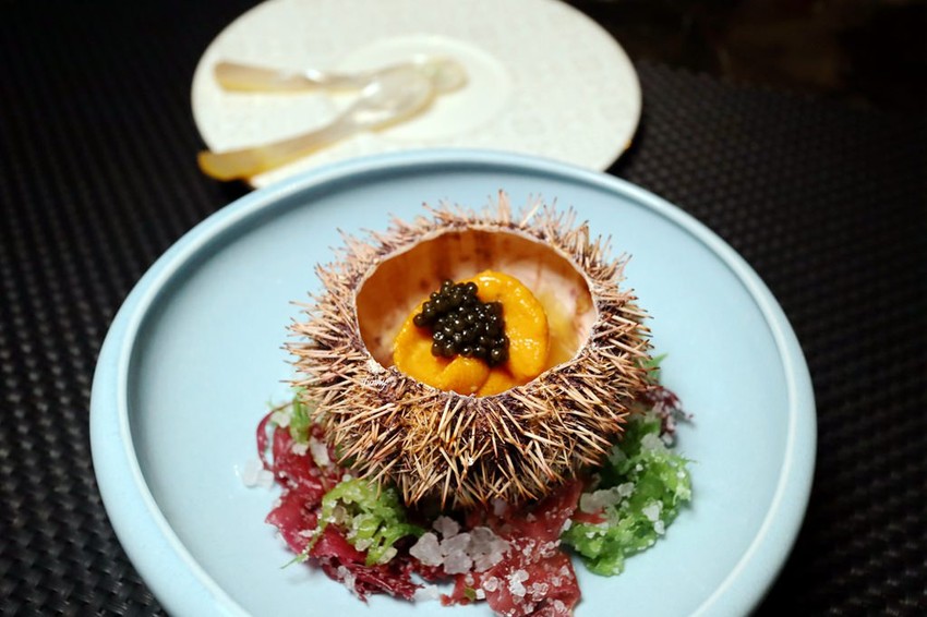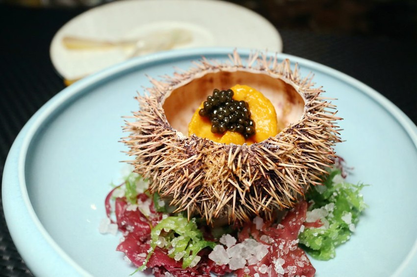 將馬頭魚帶鱗炸到酥脆,上桌時上演刨烏魚子,將烏魚子散落在魚肉上。底下襯的醬汁有昆布蛋黃醬及櫛瓜醬。另外外表有如柳橙肉般的是大器的海膽,並搭配爽脆的晚香玉筍。