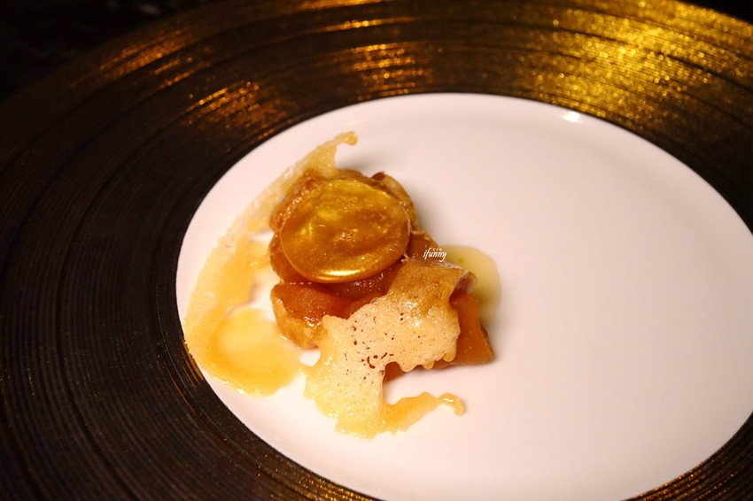 以糖霜做成蘋果咬一口的模樣,其上的金球是分子料理,裡頭是蘋果汁。