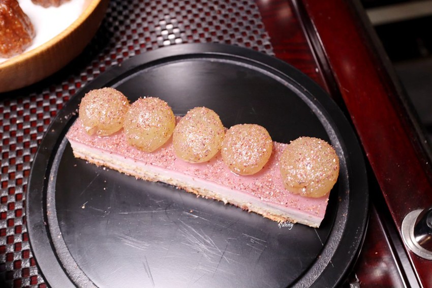 採用美國海膽,其上飾以鱘魚子醬,其下有甜美胭脂蝦肉,並襯以蔬菜高湯燉煮的柑橘果凍,柑橘果凍的微酸甜,令濃郁的海味多了清爽感。