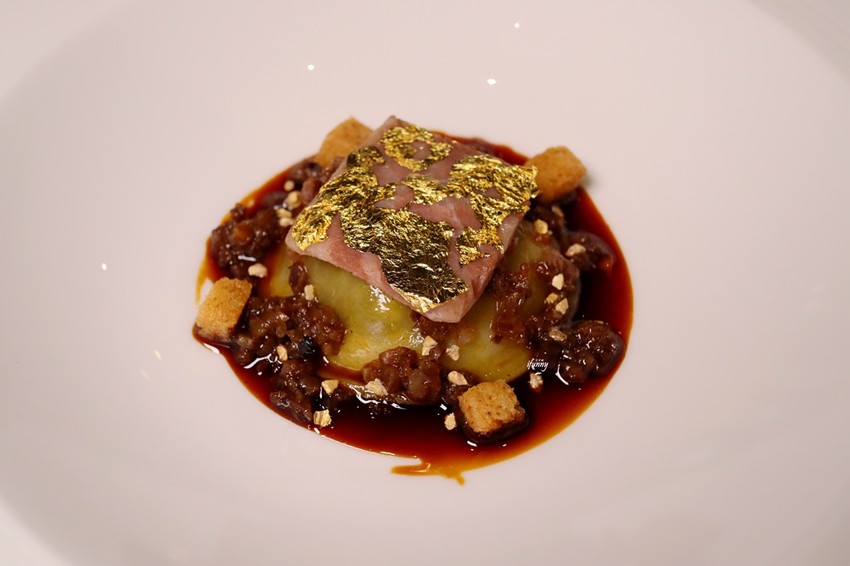 牛尾充滿膠質與帶著Q勁的餃皮吃下相當有口感。搭配的是勃根地紅酒醬汁,並以麵包丁增加口感層次。這一款餃子既富創意又兼具美味。