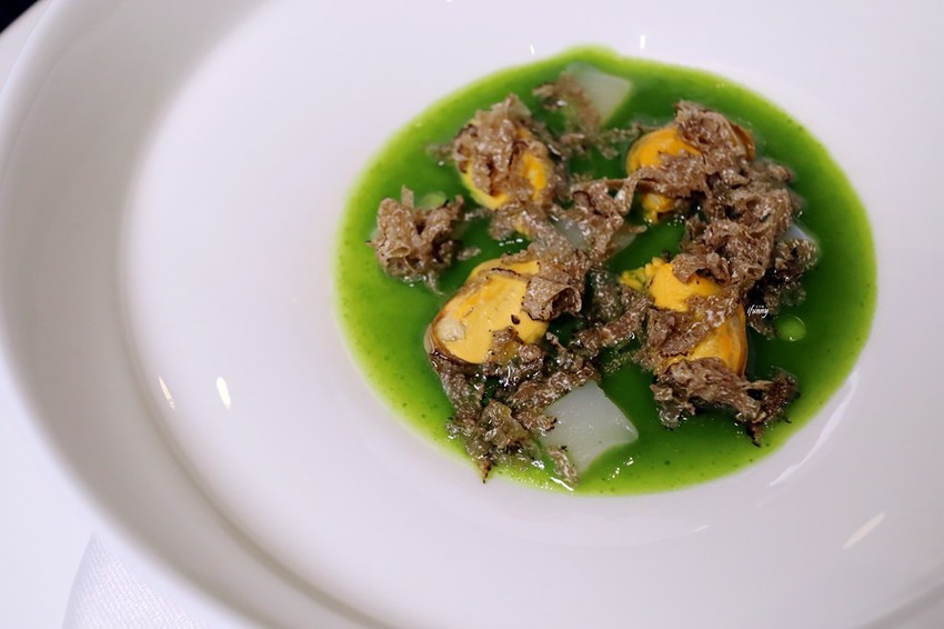 以北海道干貝加上法國淡菜,其上刨上了不少的黑松露,其下襯的是台灣珠蔥泥。
