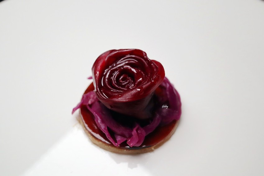 外型細緻美麗的玫瑰花是由甜菜根捲成,內夾入了豬肉泥及紅酒凍製成的法式肉糜,以布里歐麵包為底,再舖以紅酒漬紫高麗菜。