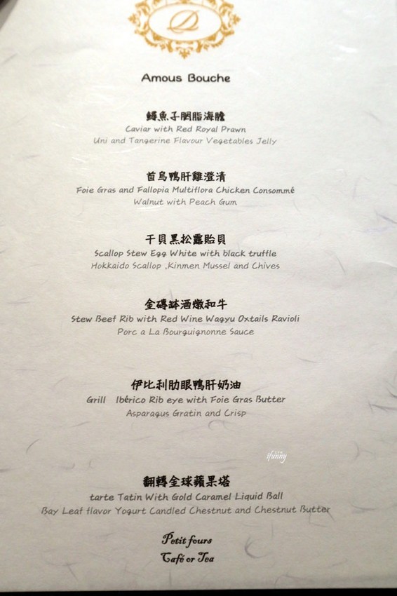 這是當天我們享用的是事先預約的德朗饗宴,這菜單是放在餐桌上的信封裡,令人對於接下來的餐點帶著慎重的期待心情。