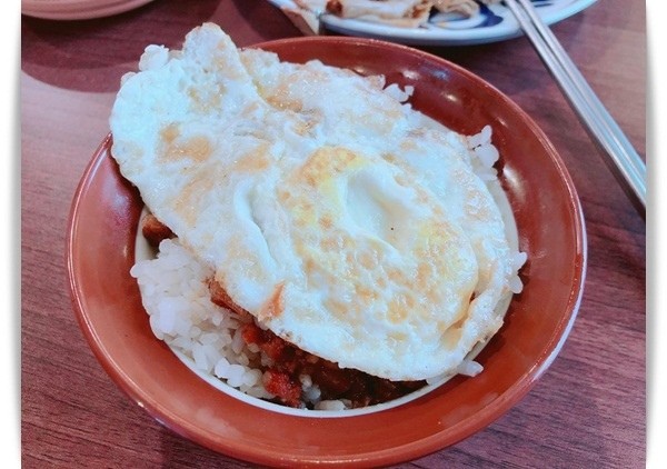 中間有顆半熟蛋拌入飯內搭配涼拌菜一起吃很清爽。