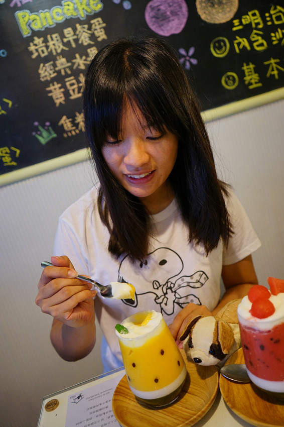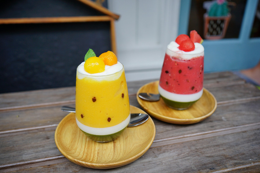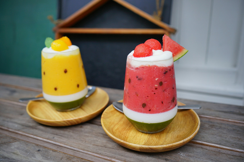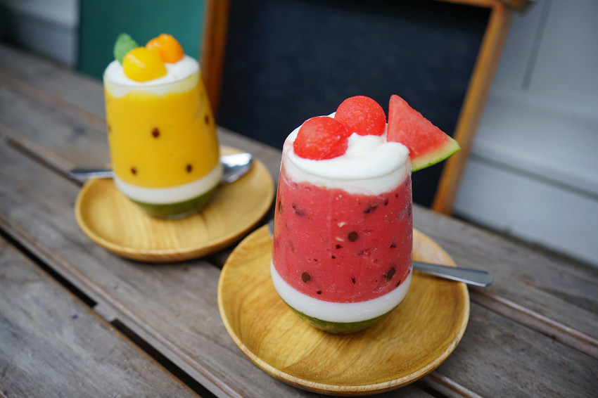 西瓜果昔吃起來是西瓜冰沙的口感,芒果果昔吃起來則是超濃郁的果泥感,杯子裡偽裝成西瓜籽的是巧克力,底下還有奶酪,真的非常非常好吃啊!!!♥♥♥♥♥五顆星大推薦,就算是專程來點上一杯都相當值得!