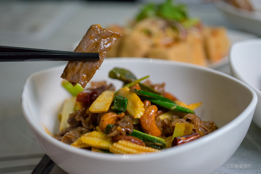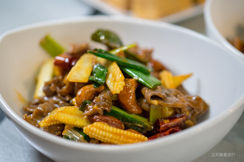 醉仙牛肉其實就是腰果辣牛肉,將牛肉片搭配著腰果、青蔥、玉米筍,再添入紹興酒及乾辣椒熱炒,不僅配色鮮艷,牛肉更是煮的恰到好處不乾不柴又吸滿了辣醬汁,真的超好吃!