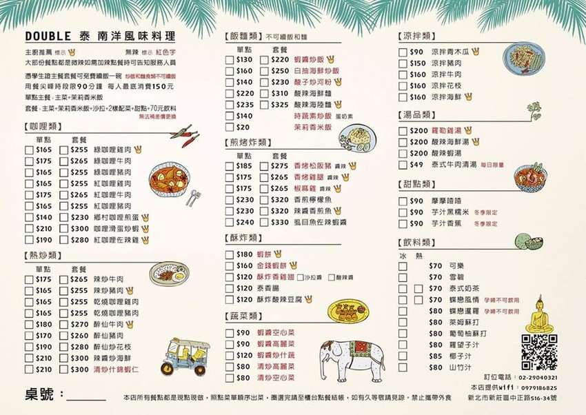 輔仁大學旁的南洋風味料理-Double泰,個人套餐及平價單點式美味料理只要90元起,提供咖哩、熱炒、飯麵、涼拌、湯品、甜點等道地餐點,吃素的朋友也有蛋奶素的時蔬素炒飯可選擇!