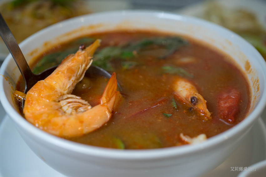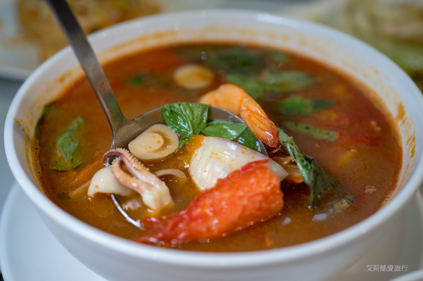 最後是艾莉絲吃泰式料理必點的酸辣海鮮湯,Double泰的酸辣海鮮湯用料超豐富,內有汶萊藍蝦、花枝、草菇、小蕃茄再加入檸檬草、香茅、南薑等辛香料調味!