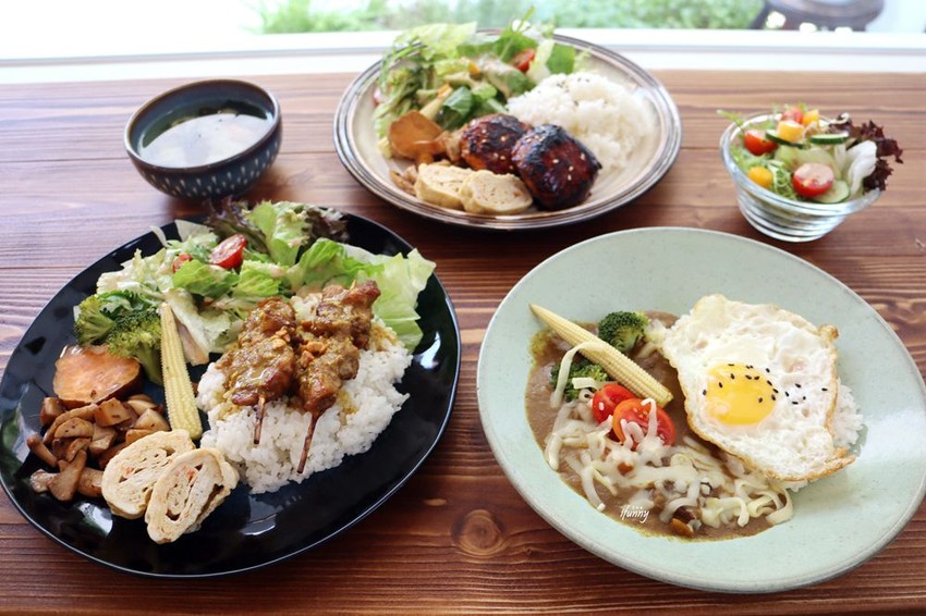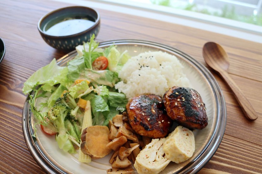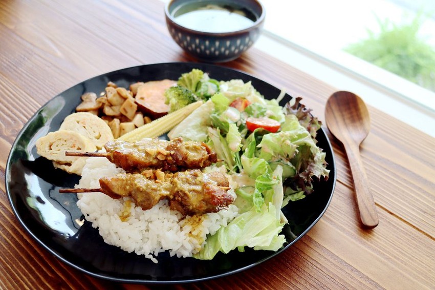 採去皮雞腿肉以花生醬及印度咖哩粉等辛香料醃漬,再將雞肉塊成串串起,利用烤箱烤熟,之後再淋上自製的椰漿沙爹醬及花生脆粒。一入口就是濃郁的沙爹醬香,好喜歡那個花生粒帶來的脆口感,加上醃漬入味且軟香的雞肉,滿滿的南洋風情。一旁襯以沙拉、胡蘿蔔玉子燒及醬烤杏鮑菇,再加上一碗昆布味噌湯,也是份量十足!