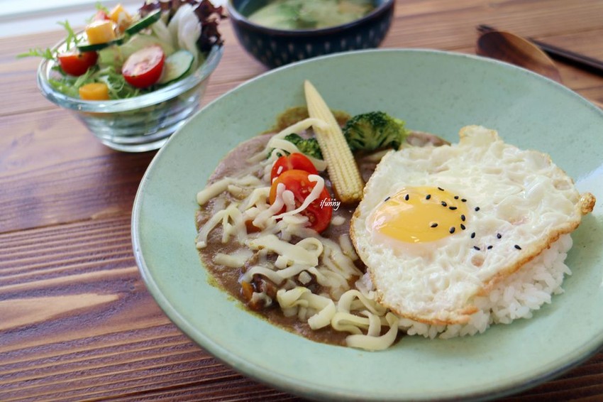 以焦糖洋蔥為底,拌炒咖哩粉、蔬菜及牛肉塊,再加入甘辛兩種口味的日式咖哩燉煮.上桌前再刨上起司絲。另外煎個半熟蛋放在越光米飯上,光以視覺就覺得營養滿分啊!