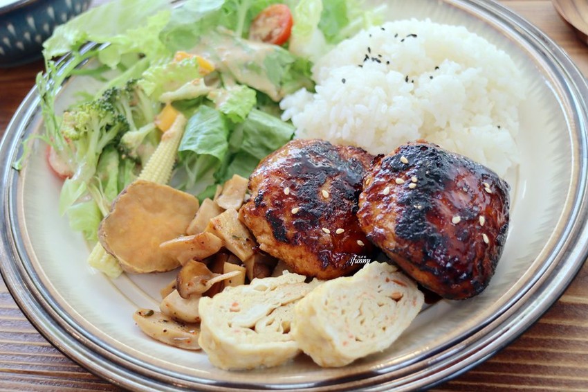 搭配上營養均衡的生菜沙拉、玉子燒,還有鹹香下飯的醬燒杏鮑菇,這一餐吃得開心又飽足!