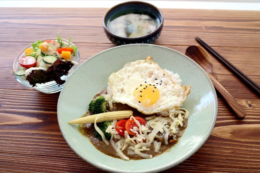 趁熱把起司融入咖哩醬中,因此醬汁更加地濃郁,微香甜帶辣的口感,拌上半熟蛋液及香Q越光米,很像是媽媽煮出來的味道,是很家常但很好吃的滋味。牛肉燉得軟嫩但不會過柴,搭配時蔬既健康又飽足!