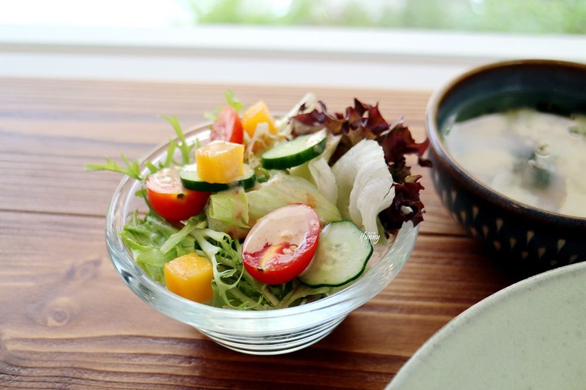 咖哩飯的沙拉是另外放的,碗內滿滿的生菜,並綴上當季新鮮芒果粒再配上胡麻醬,小小一碗沙拉提供充足的活力。