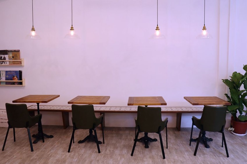沙發區一旁有這樣的雙人座位區。潔白的牆面加上燈具,靠牆的座位上舖上可愛的花磚,簡約又清新。