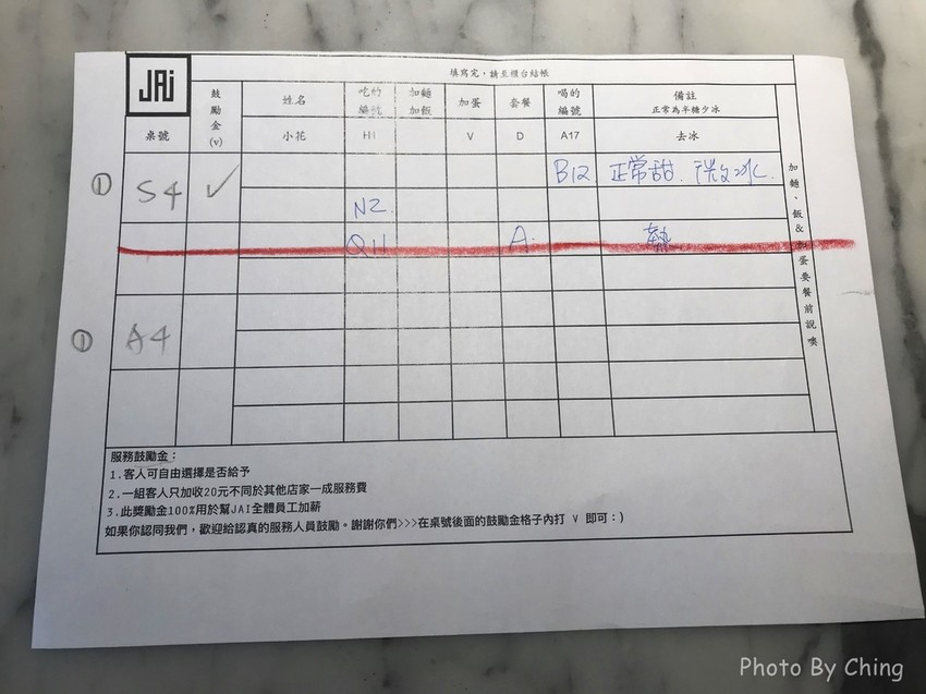 這裡採取自助式,但不是在菜單上勾選,而是用一張A5大小(A4的一半)的紙張印上一格一格讓客人填寫!!