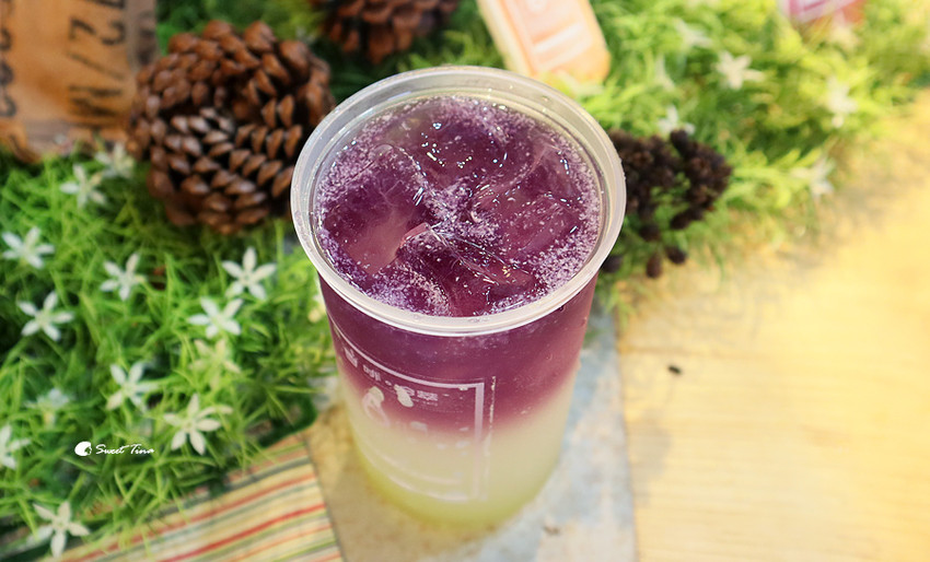 檸檬泡泡 - 這是剛調配好還沒搖晃的樣子,三個漸層色真的好美,裡頭有蝶豆花、檸檬、金桔,搖晃後就會全部呈現紫色狀了,所以想拍漸層的朋友可以提醒店員喔。