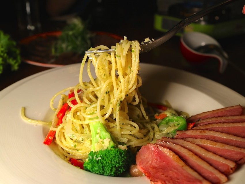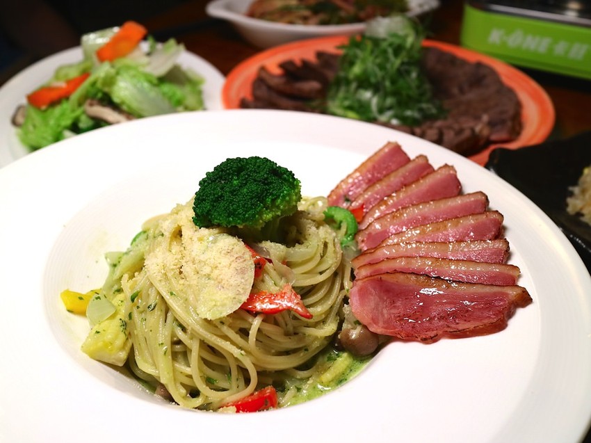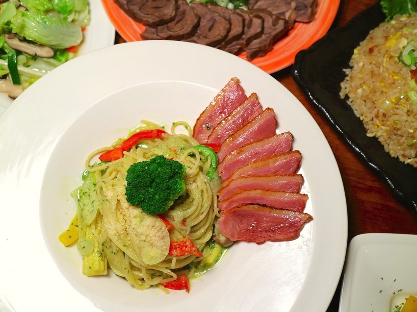這邊除了熱炒、火鍋⋯等中式料理外,也提供了多道西式料理。義大利麵的種類也不少,這道《青醬鴨胸義大利麵 》只要百元初,口味卻不隨便呢!