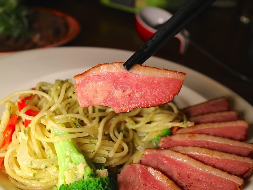 《青醬鴨胸義大利麵 》有著份量不少的鴨胸肉片,香嫩鹹甜!粉嫩色澤,超誘人!