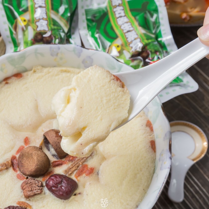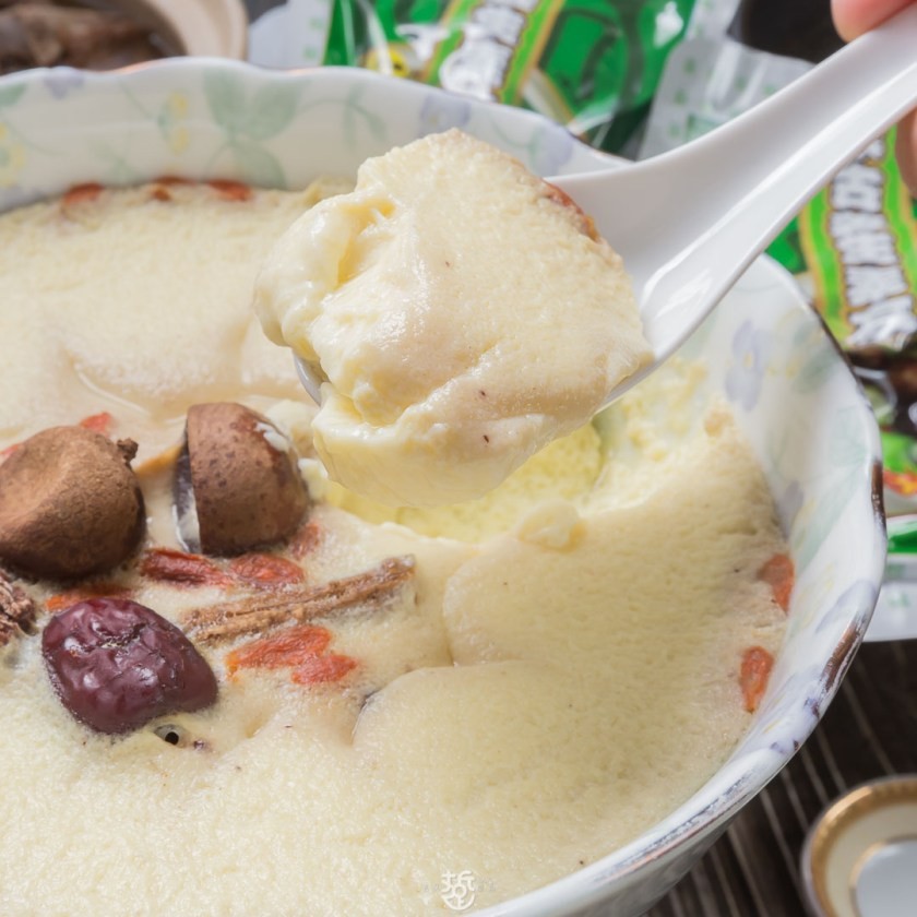將蒙古養生火鍋湯底包加入600cc冷水調勻,再用四顆雞蛋打勻後與冷高湯調和。(雞蛋與高湯比例約1:2)