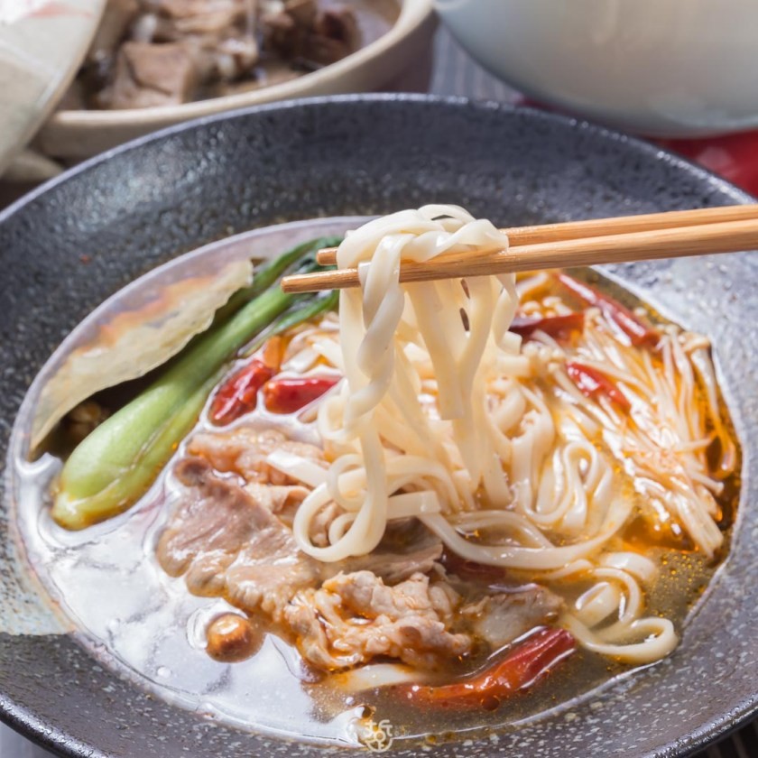再將煮好的麻辣高湯淋在面上即可食用,一包湯底約可煮兩人份的湯麵。