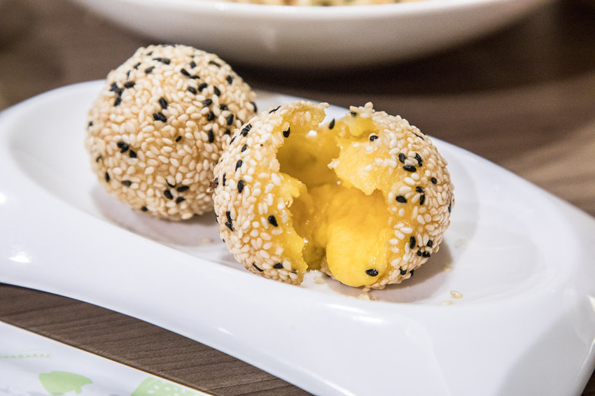 外型看起來跟一般芝麻球無異,但裡頭可是藏著大學問呢!一剝開芝麻球,裡面的半融流砂便止不住的流出來,鹹甜兼備,搭配酥軟芝麻香濃郁的外皮,好吃!