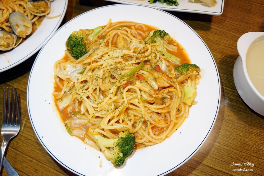 蔬菜量爆炸多就算了,茄汁也超濃郁,每根麵條都吸飽番茄的醬汁,番茄果香十足夠味,如果喜歡吃肉的朋友也可以改成其他品項,不太愛吃那麼酸口味的建議吃粉紅醬的義大利麵可能會較為適合喔。