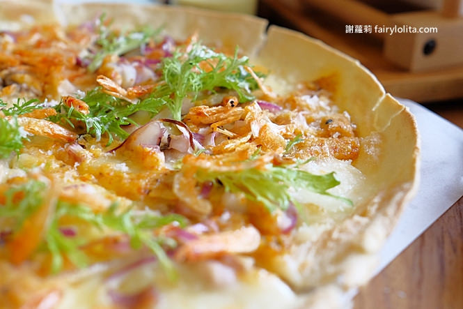 薄餅上舖著不少櫻花蝦,而且每一隻都蠻肥碩的,洪先生邊吃還邊說,怎麼櫻花蝦這麼大一隻,真的超好笑!XD