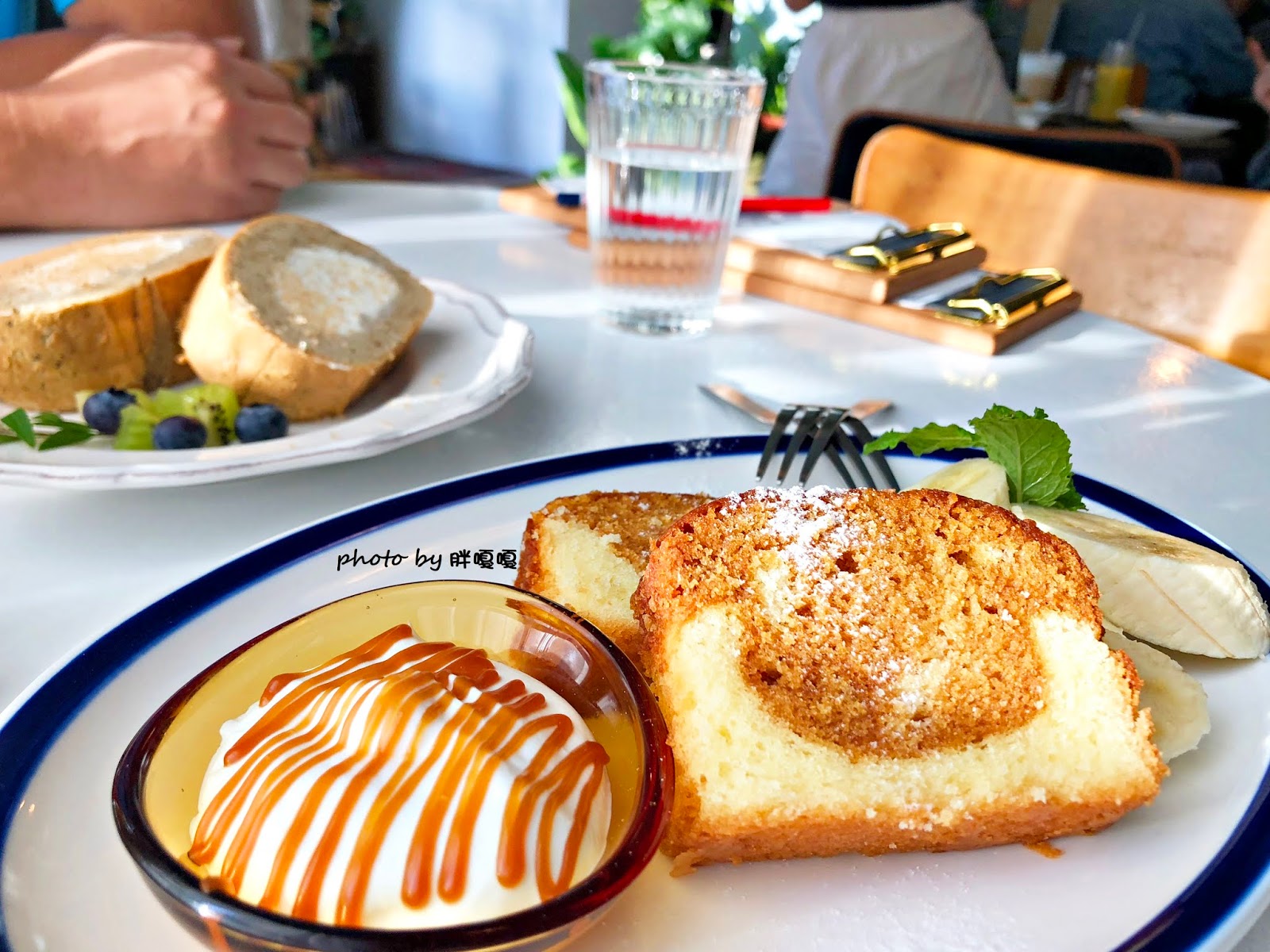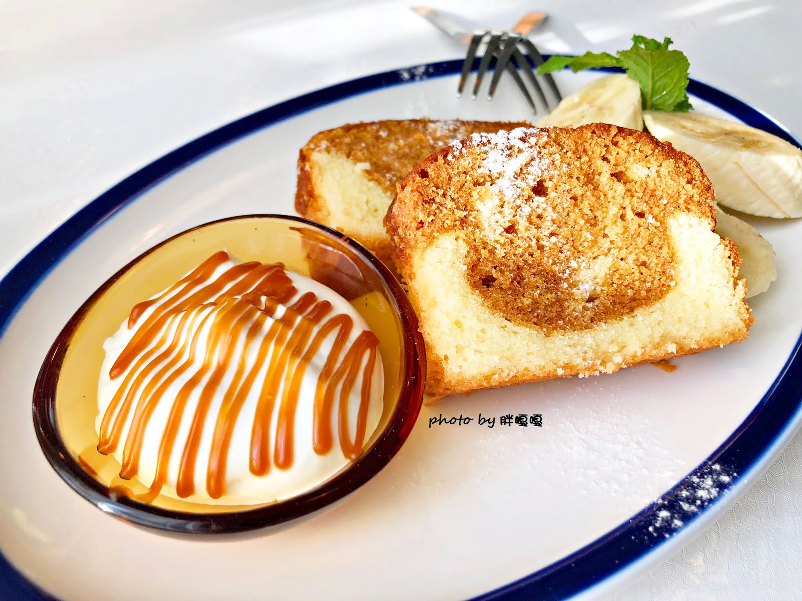 搭配一旁的新鮮香蕉和焦糖鮮奶油