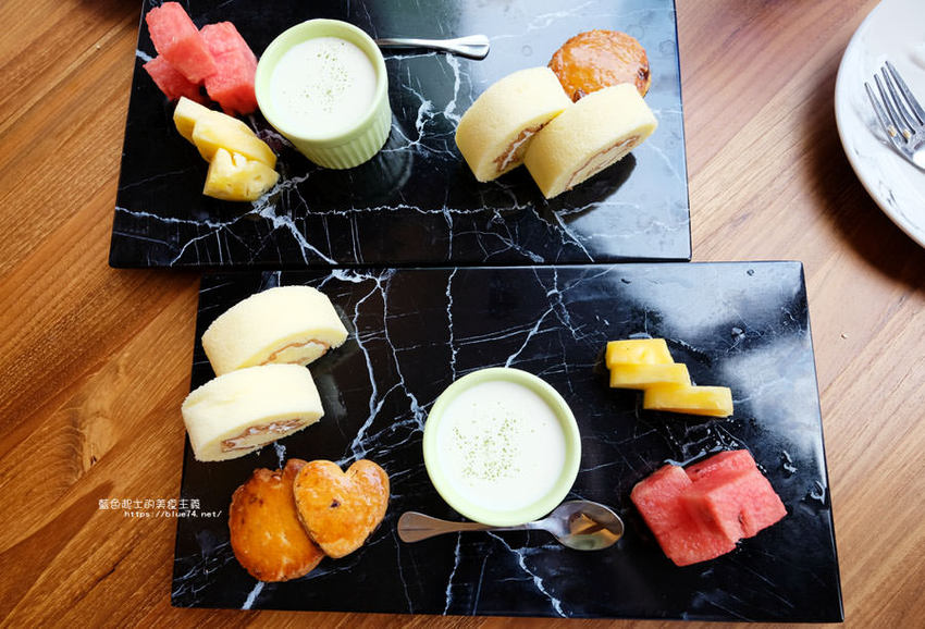 有奶酪、兩種水果、自製餅乾、蛋糕捲