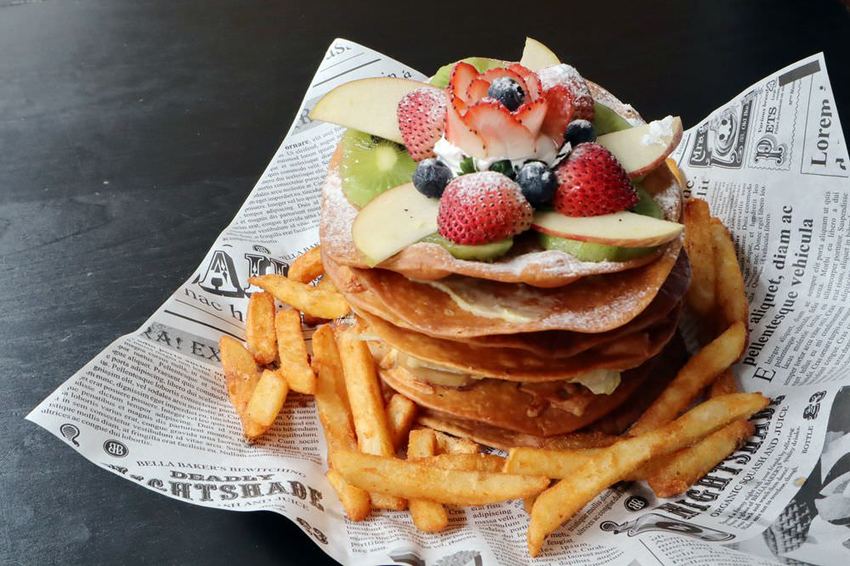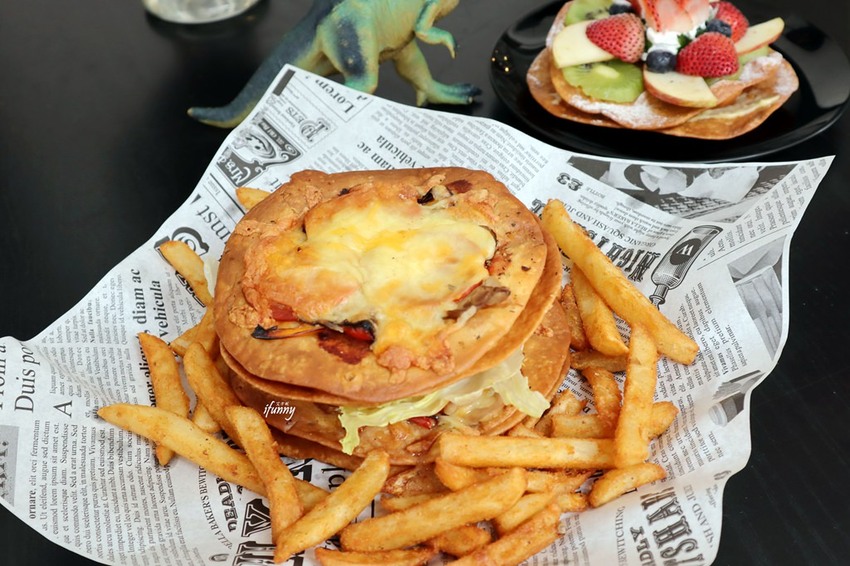 底下的幾層中,有燻雞、甜椒、洋蔥及起司組成的正規版披薩。其下還有搭配生菜的組合,加上滿滿的炸薯條,是很適合多人共享的創意餐點。