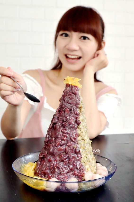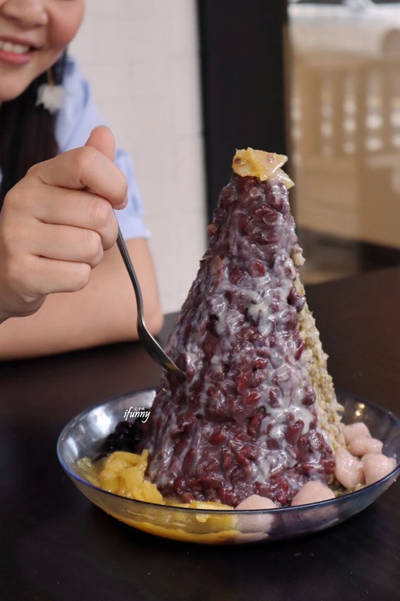 像山一樣高的冰是由紅豆冰及綠豆冰所組成,另外底下搭配鳳梨、珍珠及芋圓。