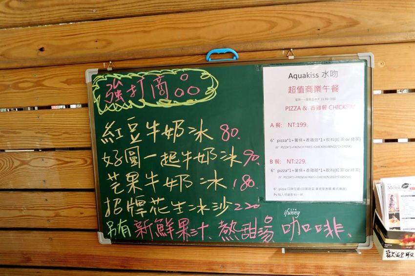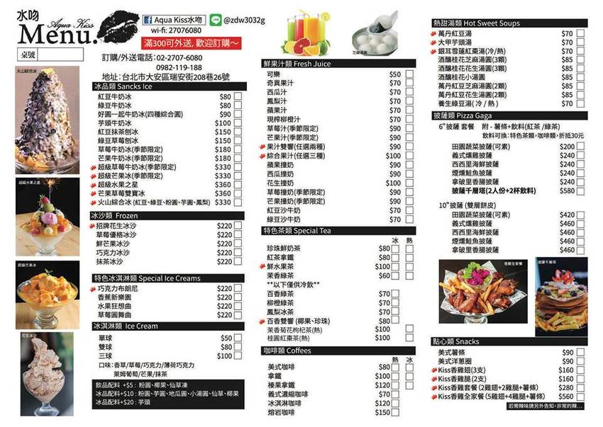 Aqua Kiss水吻的菜單,除了招牌冰品,也有茶、咖啡及熱甜湯,當然不能錯過披薩及炸雞喔!