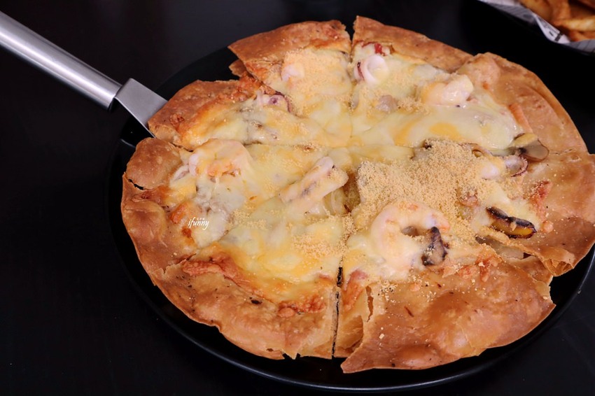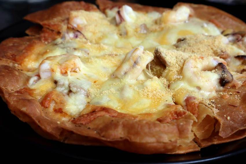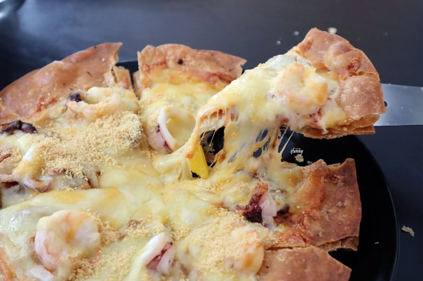 Aqua Kiss水吻的披薩最特別的部份就是酥脆的餅皮,其上滿滿的海鮮,並灑上香氣十足的起司粉。