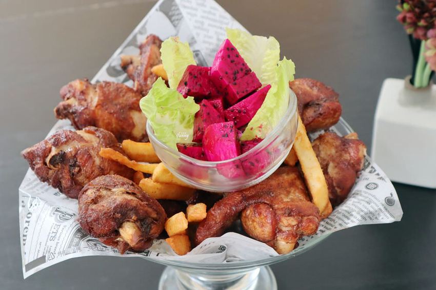 這全家餐中,有5隻雞翅、4隻雞腿及薯條,另外上面的火龍果甜得不像話。