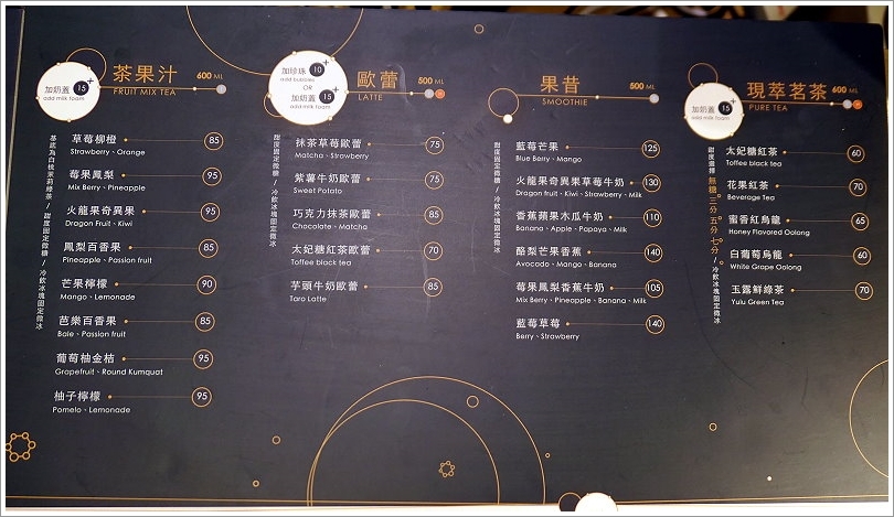 ▼MENU,除了有茶果汁之外也有歐蕾、果昔與現萃茗茶,跟一般常見的飲料店比較不一樣!