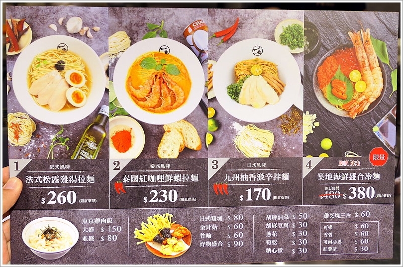▼夢想一燈的拉麵口味有別於以往只有熟悉的日式風味,這裡除了日式之外還能吃到法式、泰式風味,讓人很期待他的美味!此外也有拌麵、冷麵、雞肉飯及其他配菜的選項,有興趣的朋友也可以加點唷!