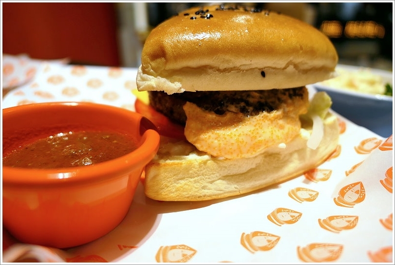 ▼明太子和牛漢堡,採用的是三角形漢堡包,看起來好特別!一旁都有附番茄肉醬,可以淋上去也可以沾附享用!