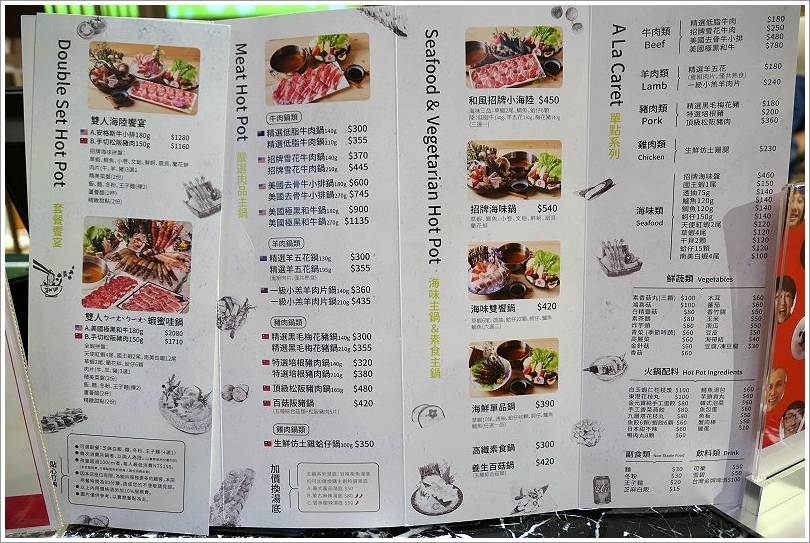 ▼MENU,除了套餐之外也有各式肉品主鍋、小海陸、海味鍋、素食鍋及單點,選擇還不少!