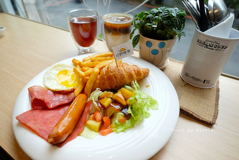 早餐想吃的比較營養又飽的人,則是可以點上這份主廚推薦的日野經典可頌拼盤$200,內有冰火蜜可頌、脆腸、火腿、培根、沙拉、美式脆薯、荷包蛋,附30元飲料一杯超過補差額