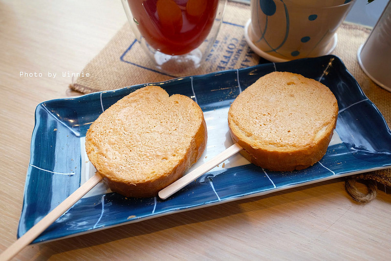 花生切片$30,一般的烤吐司大多都是方形單片提供較多,這兒的烤吐司用的是法國麵包再插上竹棍,方便大家可以拿著直接享用