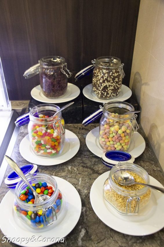 一旁還有可以加入冰淇淋的彩色脆片及糖果,整個太邪惡了。
