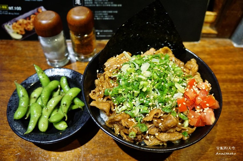 丼飯均附小菜毛豆一疊喔,有肉有飯有小菜一整個很豐富呢。