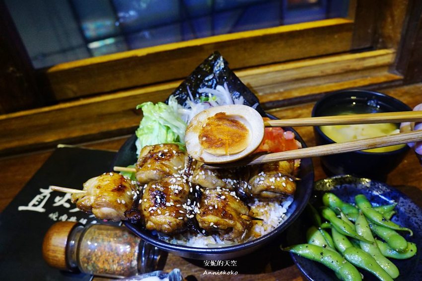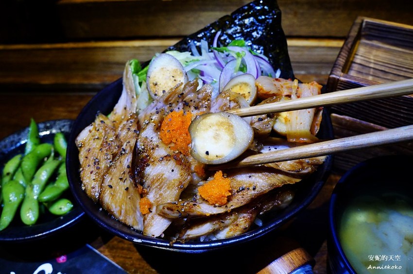 去骨雞腿肉切成塊狀,丼飯裡直接擺上兩串,分量給得很有誠意呢,而且丼飯裡配菜超豐富的,有糖心蛋、牛番茄跟生菜,飯裡頭還有洋蔥柴魚,丼飯還穿插了一大片海苔,很濃郁的日式味道。